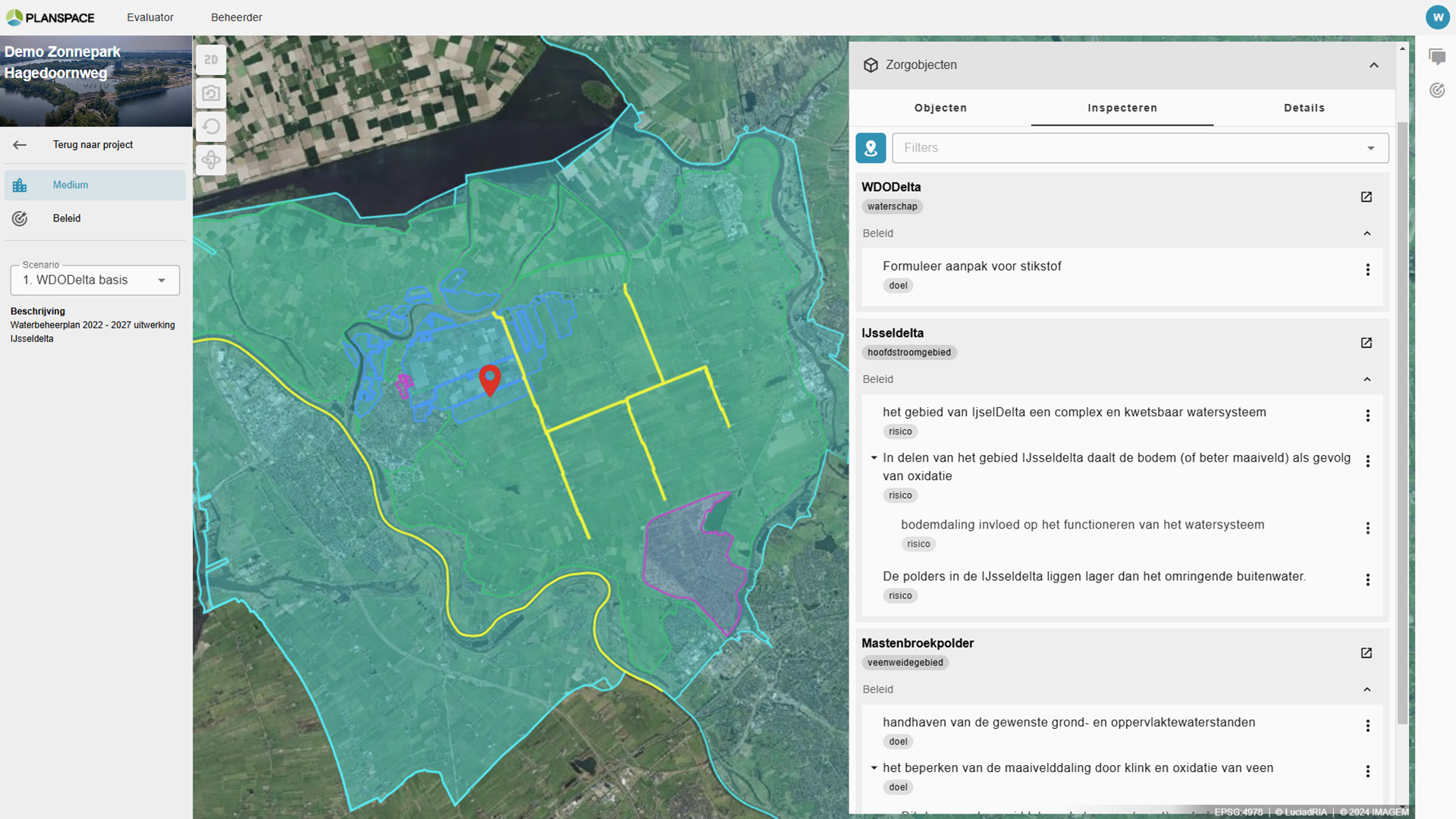 Vervolgens werden de fysieke gegevens van de Koekoekspolder, een van de meest complexe gebieden van WDODelta, verzameld en gekoppeld aan dit model via een gedeelde taxonomie. Dit leverde een ‘beleidsbewuste digital twin’ op: een krachtige digitale omgeving die beide werelden samenbrengt en die scenario vorming mogelijk maakt.