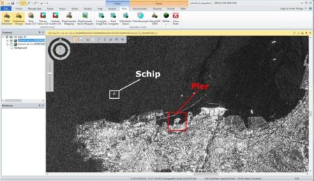 Wanneer we het Sentinel-1A radarbeeld van 5 augustus bekijken in ERDAS IMAGINE® zien we een grof zwartwit beeld verschijnen, de pixelresolutie van de radar is immers met 2,7 bij 22 meter minder hoog dan ons eerdere beeld van Worldview 3. We zien ook de krater bij de pier waar de explosie plaatsvond.