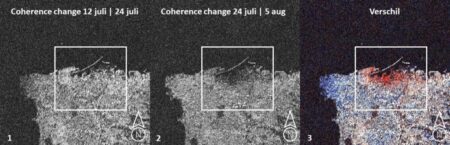 Het verschil tussen deze twee coherence beelden (beeld 3, bovenstaande afbeelding) is vervolgens met dit model zichtbaar gemaakt. Deze verschillen (de rode tinten) in het beeld visualiseren de gewijzigde radar reflectie, veroorzaakt door ingestorte of beschadigde gebouwen en infrastructuur, puin en stof veroorzaken eveneens wijzigingen in de radar coherence.
