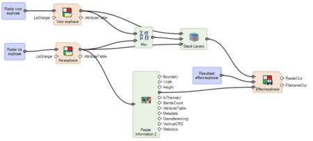Dat verschil kunnen we vervolgens classificeren en combineren met ons eerder beeld uit afbeelding 2. Niet alleen in het havengebied, maar ook in de districten om de haven zijn de gevolgen van de explosie zichtbaar.