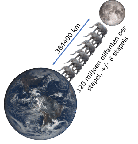 Dat is een ongelofelijke hoeveelheid afval die we kwijt zijn. Dat is zoveel, we zouden het volledige landgedeelte van de aardoppervlakte (144,5 miljoen km2) met een laag afval plastic kunnen bedekken. Terug naar de olifanten. Een Afrikaanse olifant weegt gemiddeld 6000 kg, dus 5,7 miljard ton komt overeen met 950 miljoen olifanten (bron: National Geographic). Een Afrikaanse olifant is gemiddeld 3,2-meter hoog, dus met 950 miljoen olifanten kunnen we bijna 8 stapels van olifanten maken, van de aarde naar de maan. In 70 jaar tijd zijn we het equivalent van 950 miljoen olifanten aan plastic afval kwijtgeraakt. Waar is het gebleven?
