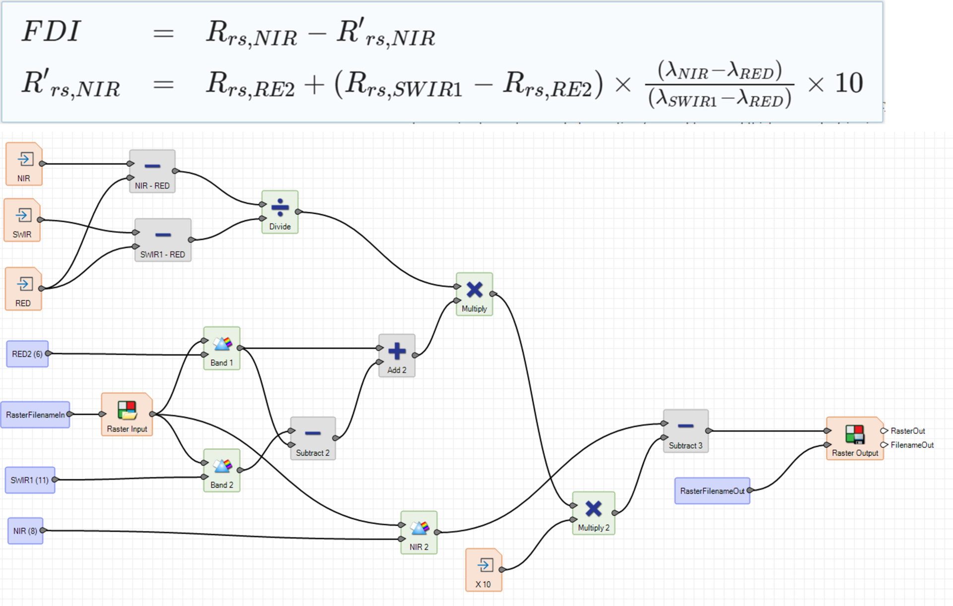 Sentinel 2 beelden zijn bekend binnen ERDAS IMAGINE, de NDVI is een standaard toepassing en de Formule van de FDI kan, zoals onderstaand wordt weergeven, binnen de Spatial Modeler in ERDAS IMAGINE ‘geconfigureerd’ worden.