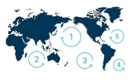 Een kaartje van de The Ocean Cleanup brengt duidelijk de uitdaging in beeld, de verschillende “plastic garbage belts” in de wereld ontstaan juist op de plekken waar de verschillende koude en warme golfstromen elkaar ontmoeten.