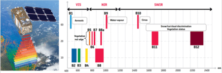 Als een soort grote stofzuiger neemt de Sentinel 2 satelliet verdeeld over in 13 verschillende banden in het elektromagnetisch spectrum data waar, terwijl deze op een hoogte van 786 km komt overvliegen. Het beeld dat genomen wordt, beslaat een gebied van 110 bij 110 km, een beste ‘bak’ met data.
