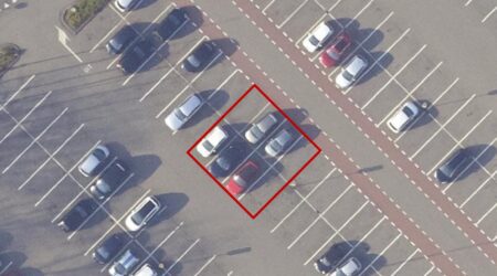 Nu hebben Sentinel-2 beelden een behoorlijk grove resolutie, deze resolutie (een pixel) is 10×10 meter. Om nu plastic afval te kunnen ontdekken in een pixel moet in zo’n 60% van de oppervlakte plastic voorkomen. Onderstaand plaatje geeft hier een voorstelling van, 1 pixel van een Sentinel-2 beeld waar de FDI van berekend kan worden laat zich het beste vergelijken met 8 parkeervakken waarin minimaal 5 auto’s geparkeerd staan.