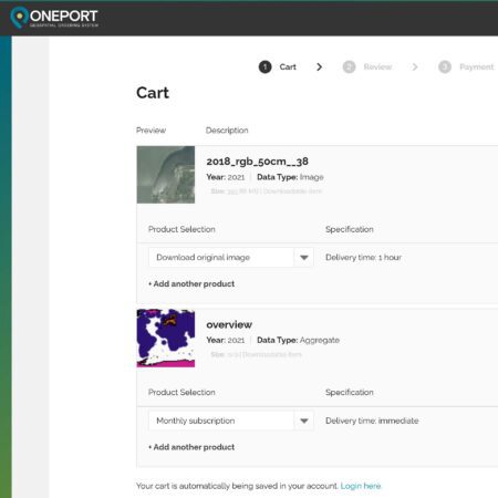 Oneport is meer dan een online gegevenscatalogus. Deze oplossing voorziet in een compleet bestelsysteem voor geografische data. Hiermee bepaal je zelf wat je wilt aanbieden en tegen welke prijs. Pas verschillende verkoopmodellen toe en laat afnemers zelf de gewenste opdracht samenstellen.